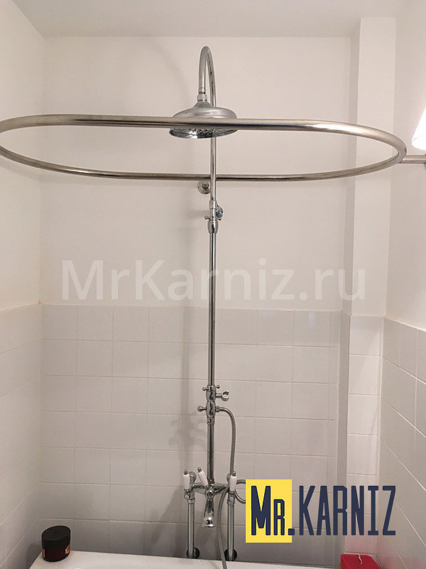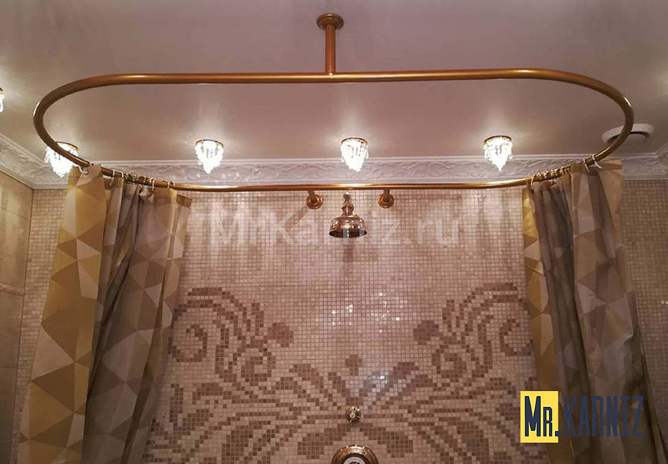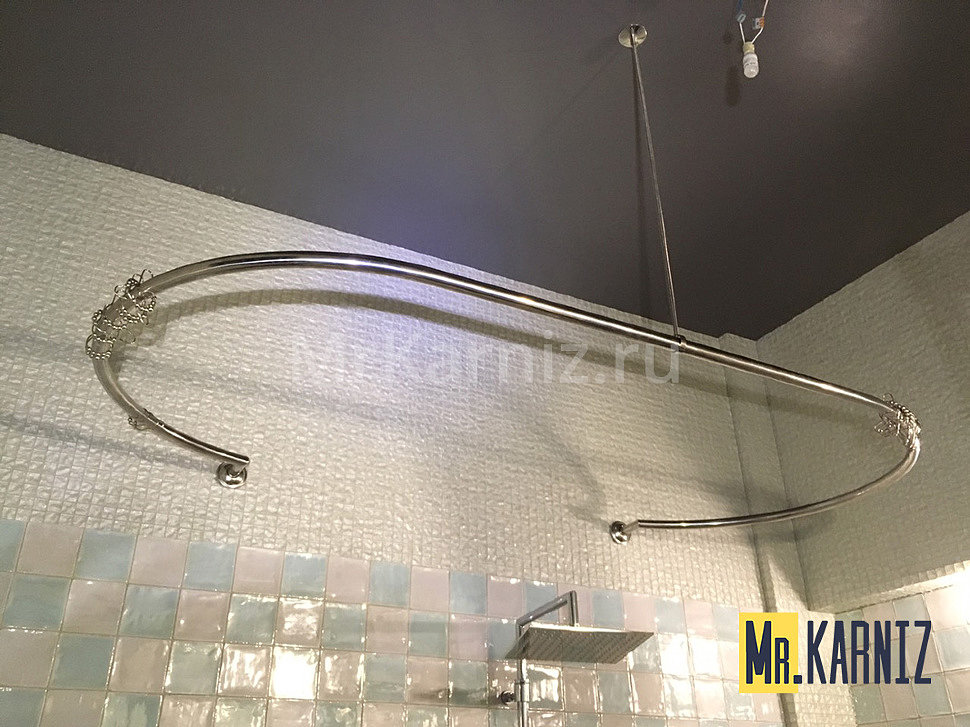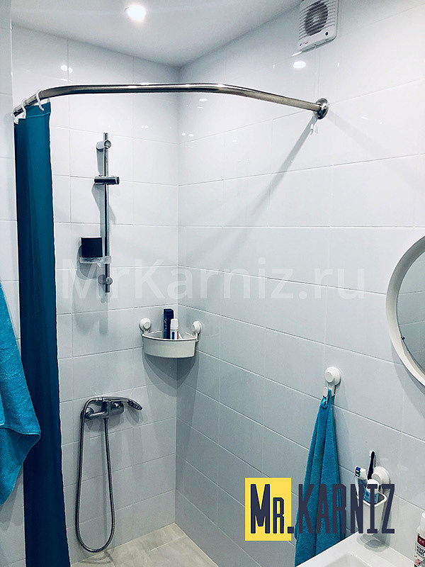 Каждая такая штанга в точности повторяет конфигурацию поддонов (ванн). Благодаря карнизам с нанизанными на кольца шторками душевая смотрится элегантно, создается единая законченная композиция.